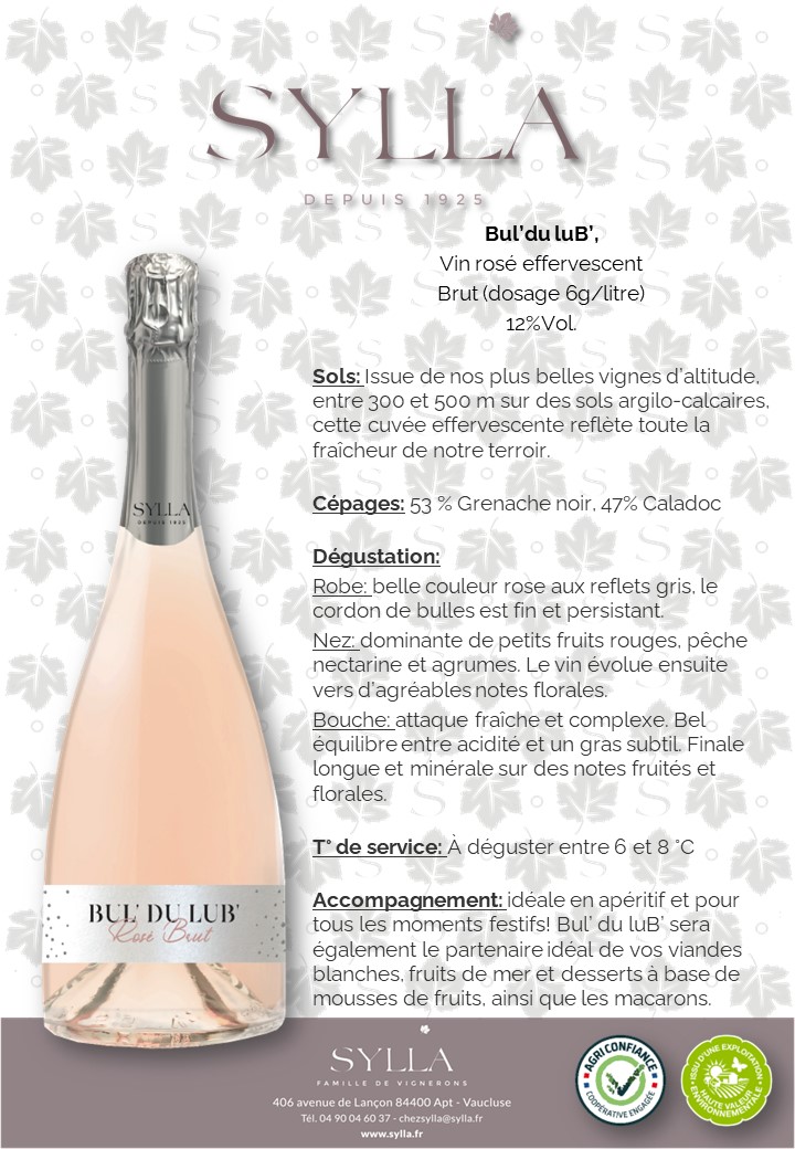 BUL’ DU LUB’: Une bulle locale…53% Grenache, 47% Caladoc. Idéale en apéritif et pour tous les moments festifs !